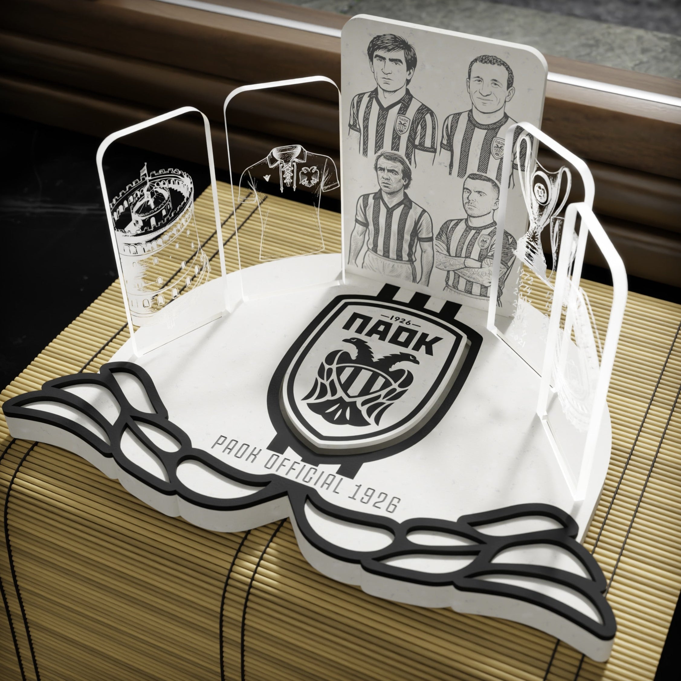 Στο συγκεκριμένο επιτραπέζιο φωτιστικό ξεδιπλώνεται μέσα απόκάθετα χαραγμένα plexiglass η ιστορία που φέρει μαζί της η ομάδα τουΠΑΟΚ.