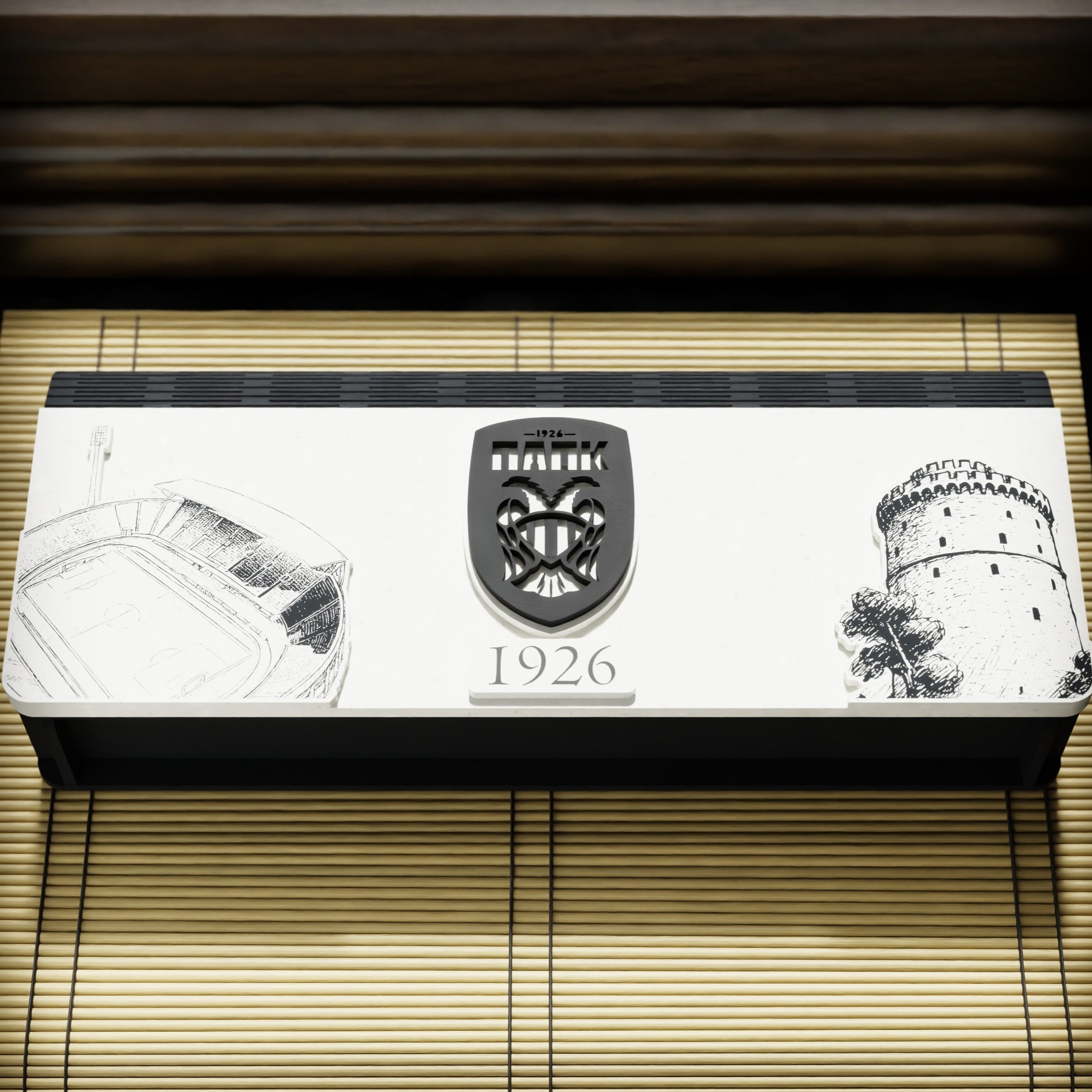 Ένα φωτιστικό με κεντρικό στοιχείο το λογότυπο της Ομάδας του ΠΑΟΚ. Στο φόντο ο πύργος της Θεσσαλονίκης και το θρυλικό γήπεδο τ...