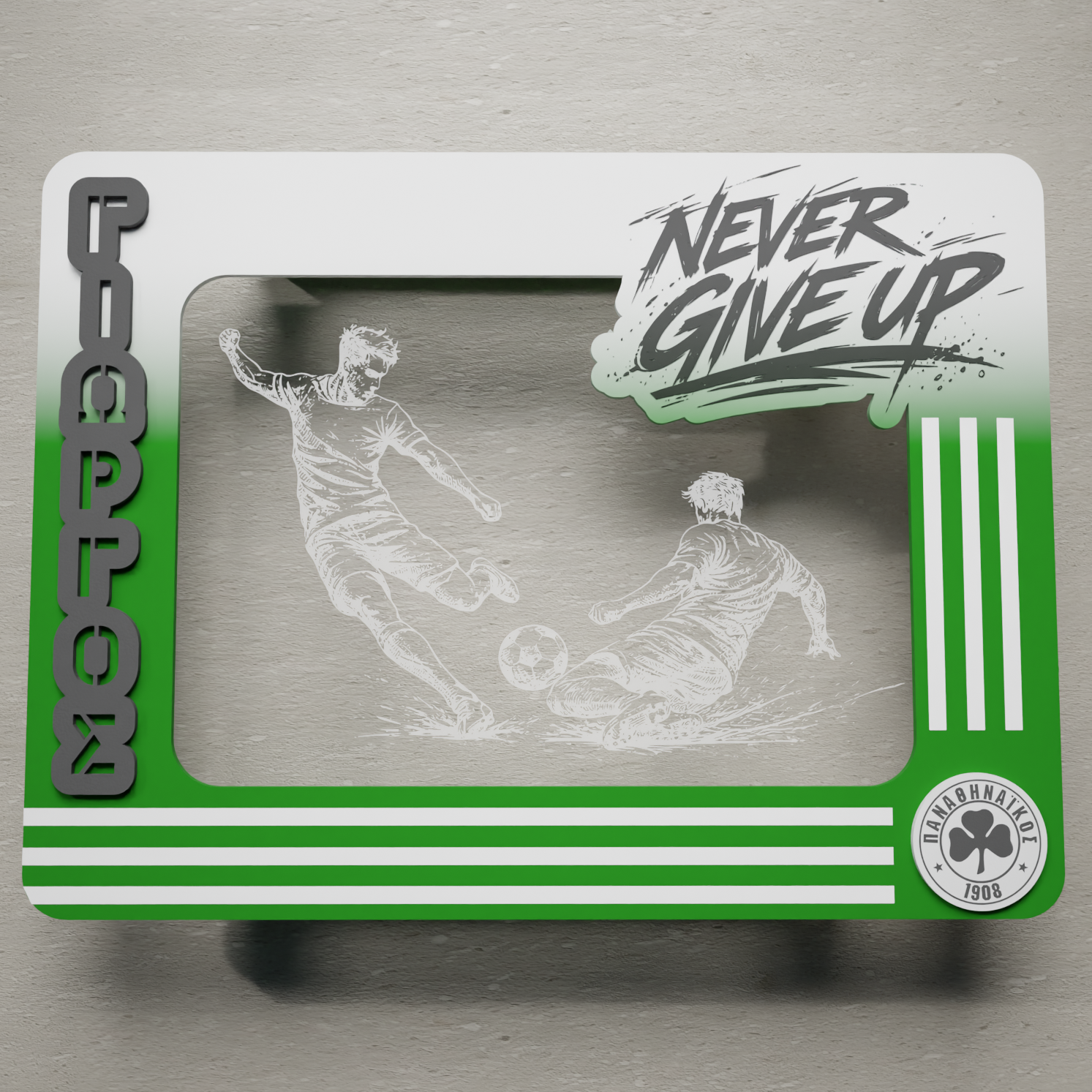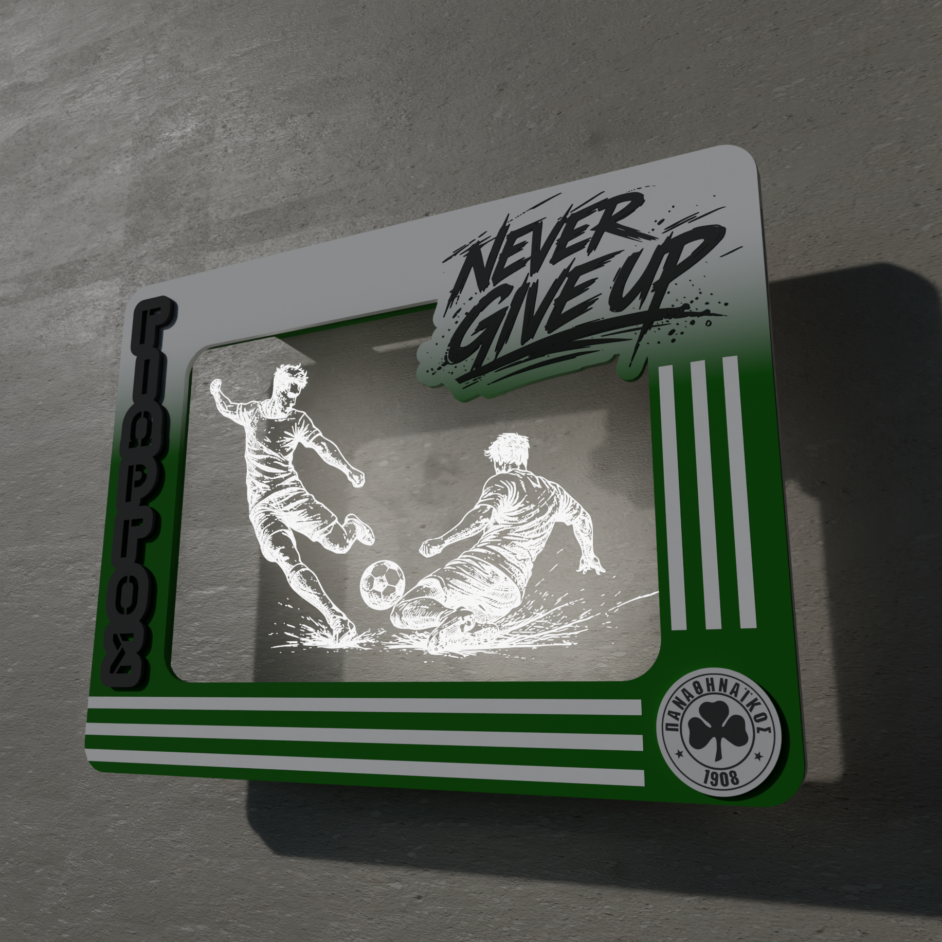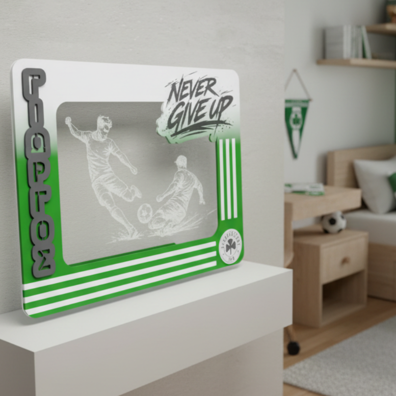 Το κάδρο είναι κατασκευασμένο από ξύλο και plexiglass, με ιδιαίτερη χάραξη που αναδεικνύει τη δυναμική κίνηση του παιχνιδιού και το λογότυπο που θα επιλέξετε, προσφέροντας ένταση, ενέργεια και μοντέρνα αισθητική.