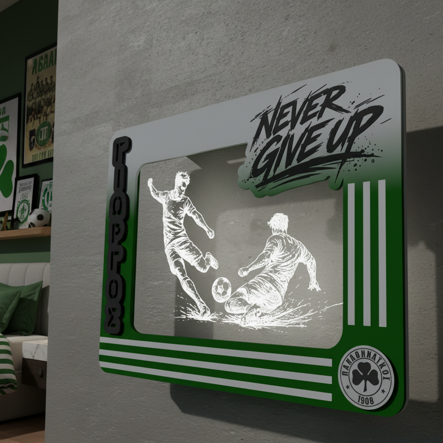 Ένα εντυπωσιακό φωτιζόμενο κάδρο, εμπνευσμένο από το πάθος, τη δύναμη και τη μαγεία του αθλητισμού. Το σχέδιο αποτυπώνει δυναμικά τη φιγούρα ενός ποδοσφαιριστή σε στιγμή δράσης μαζί με το σήμα της επιλογής σας, δημιουργώντας ένα μοναδικό διακοσμητικό που ξεχωρίζει σε κάθε χώρο.