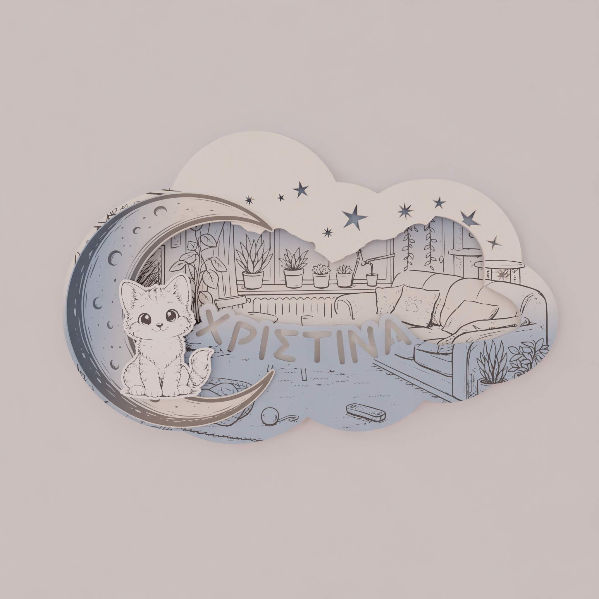 Το όνομα του παιδιού χαράσσεται στο σχέδιο, κάνοντας το φωτιστικό μοναδικό και απόλυτα προσωπικό. Ο απαλός φωτισμός LED 7 χρωμάτων λειτουργεί ιδανικά ως νυχτερινό φως, χωρίς να κουράζει τα μάτια, προσφέροντας ζεστή ατμόσφαιρα στο χώρο.