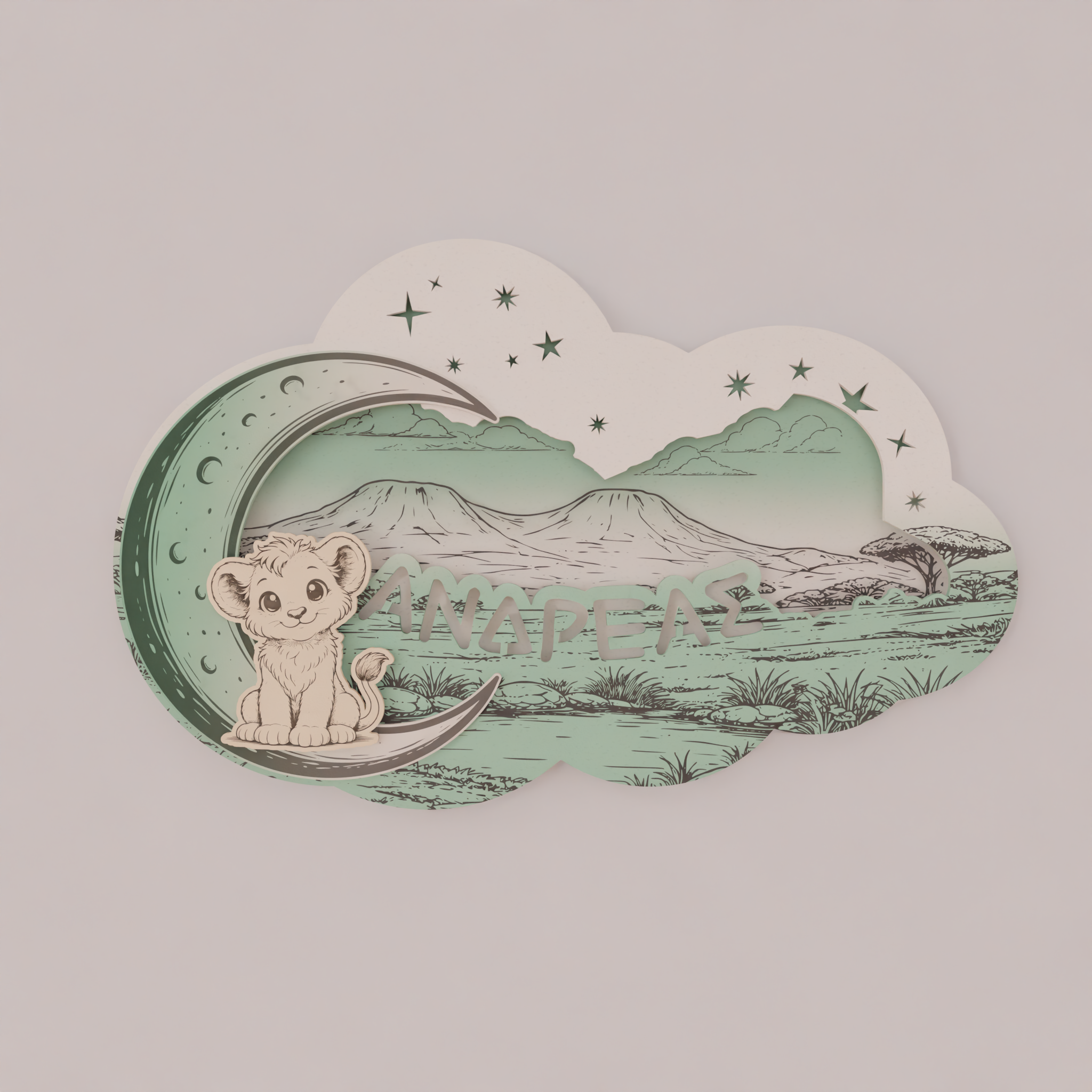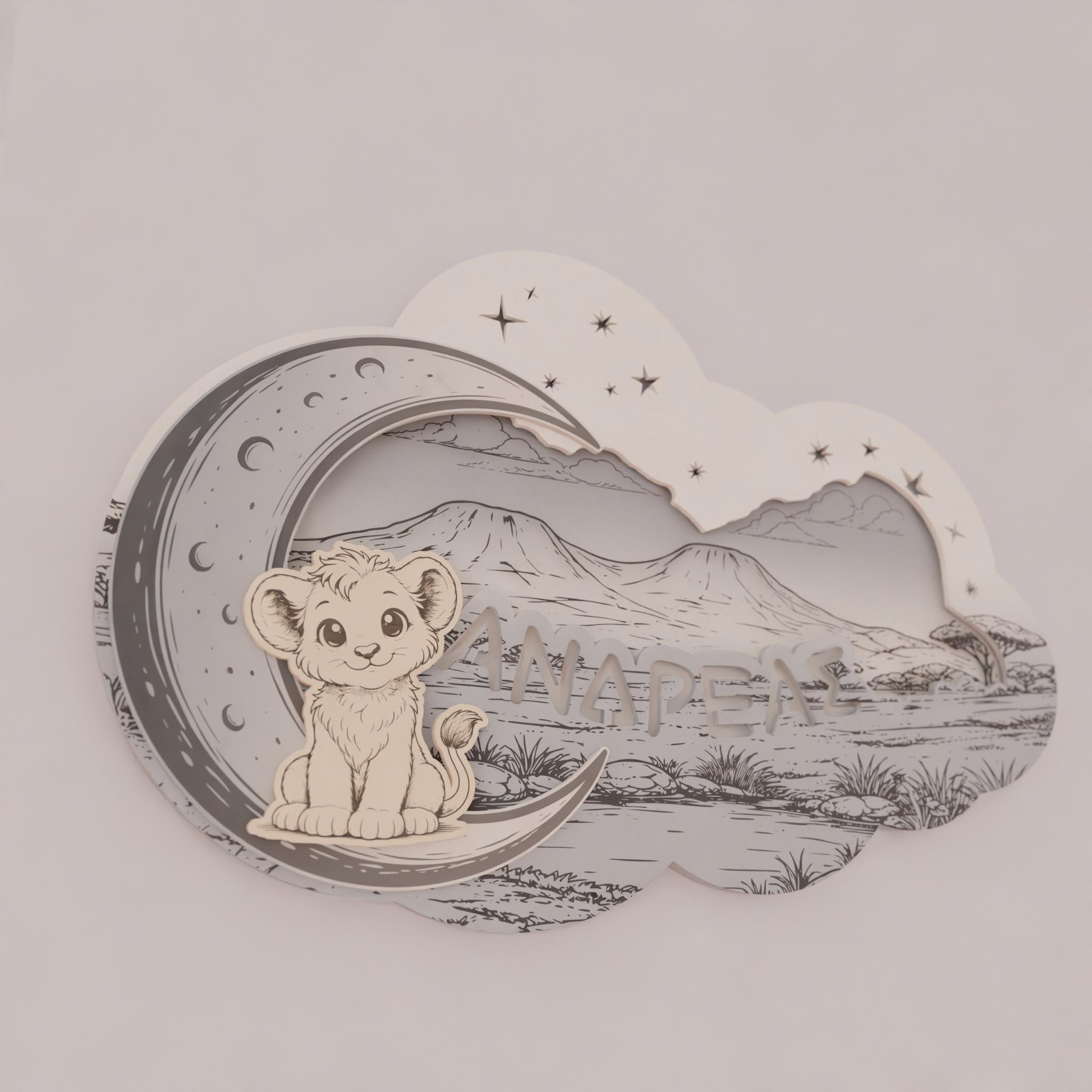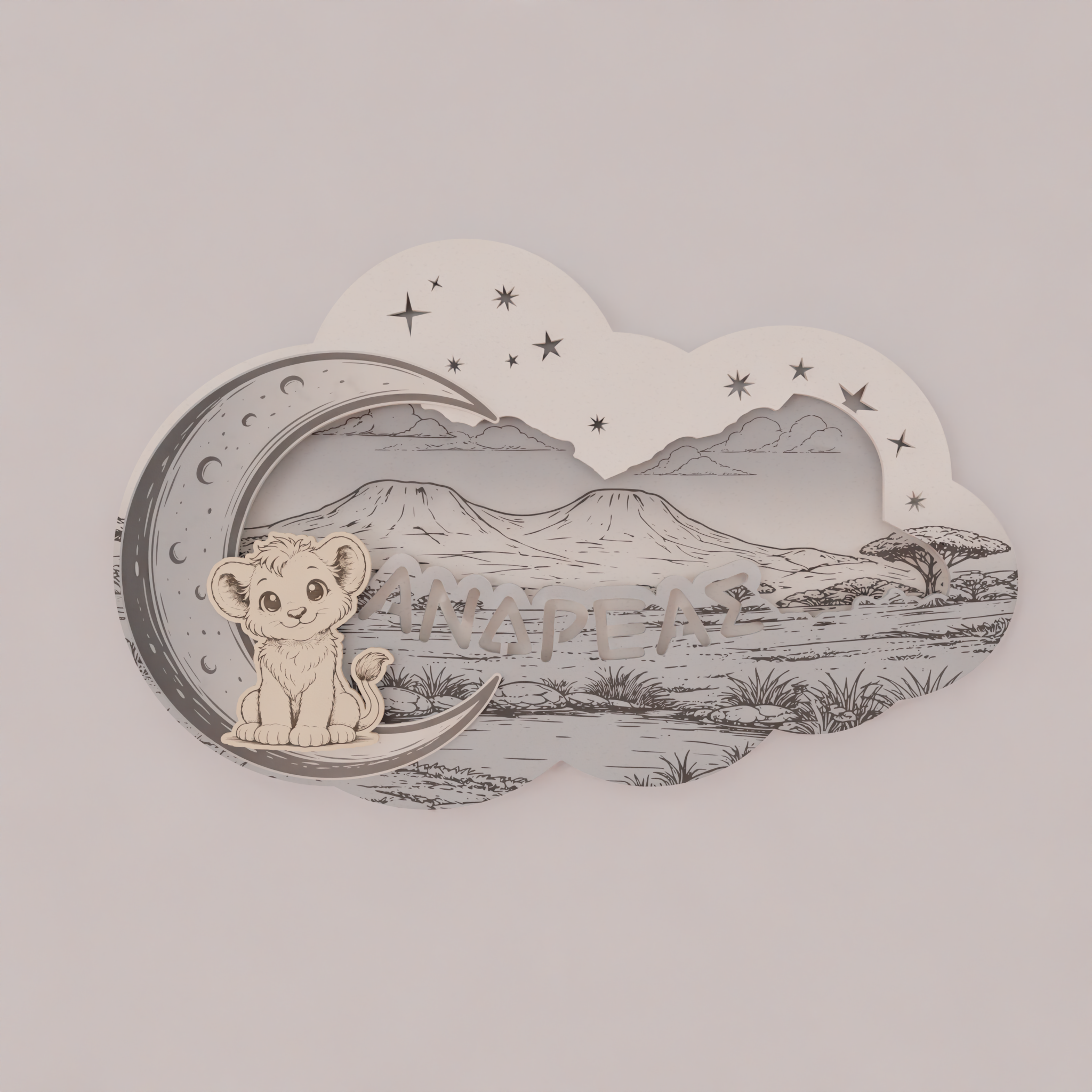 Το όνομα του παιδιού χαράσσεται στο σχέδιο, κάνοντας το φωτιστικό μοναδικό και απόλυτα προσωπικό. Ο απαλός φωτισμός LED 7 χρωμάτων λειτουργεί ιδανικά ως νυχτερινό φως, χωρίς να κουράζει τα μάτια, προσφέροντας ζεστή ατμόσφαιρα στο χώρο.
