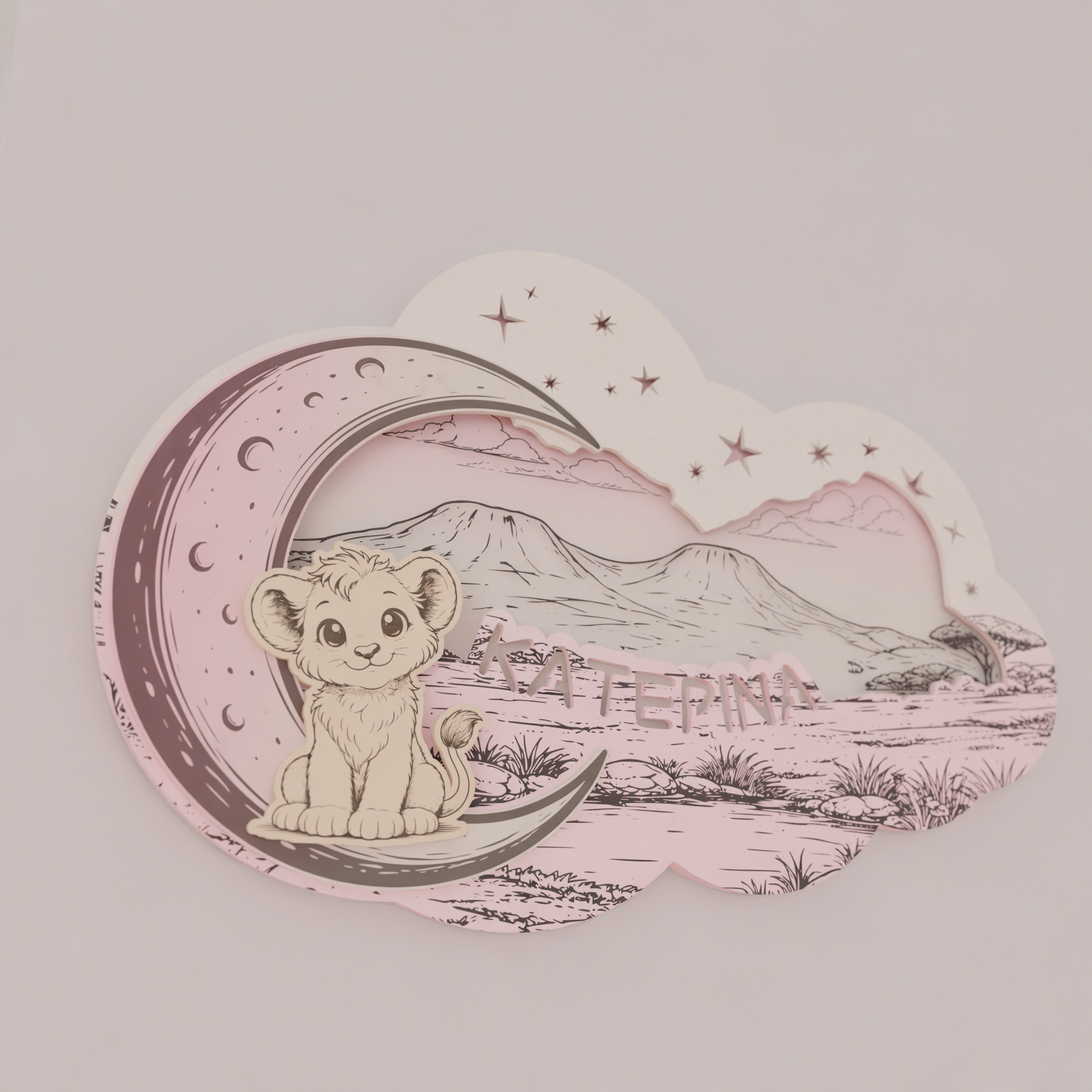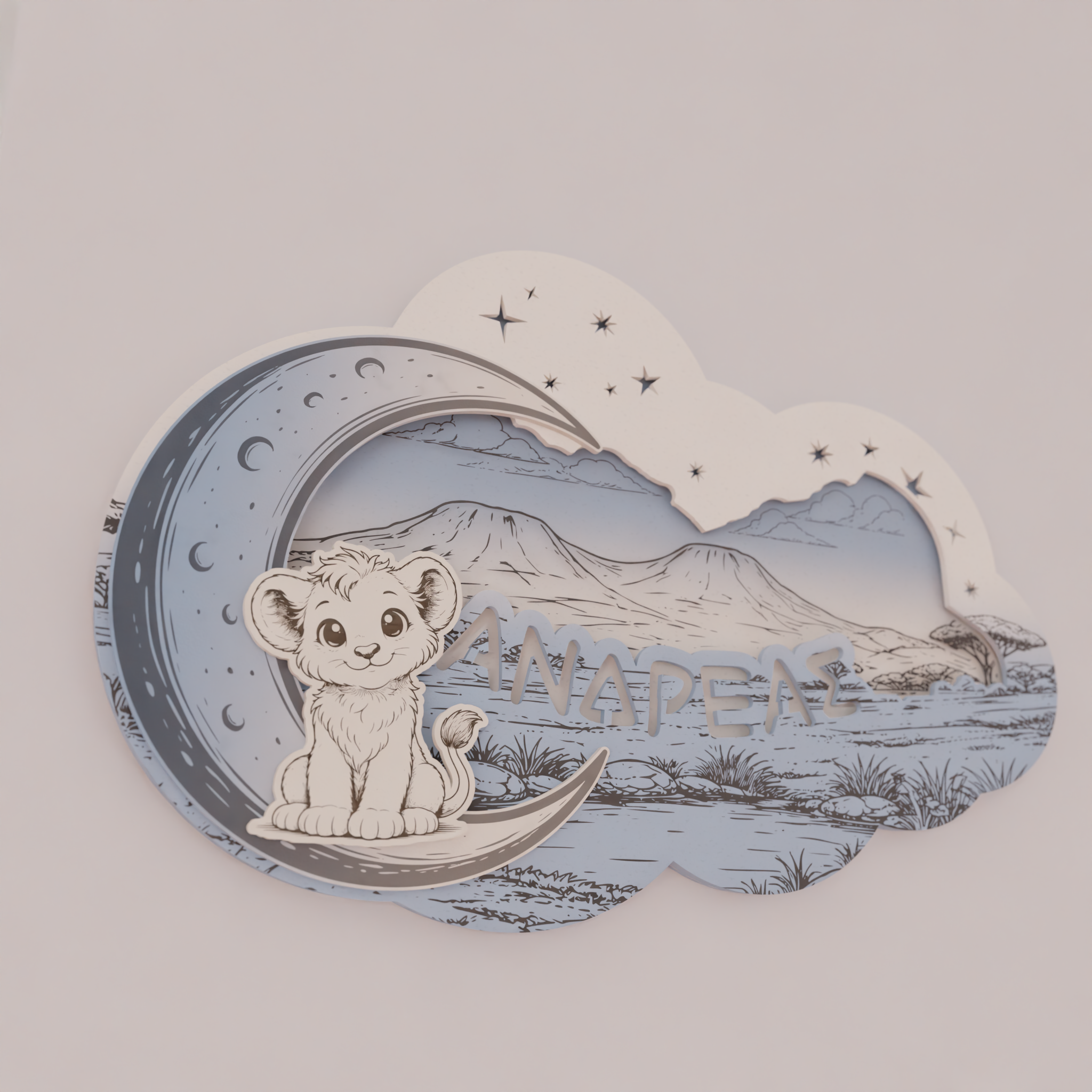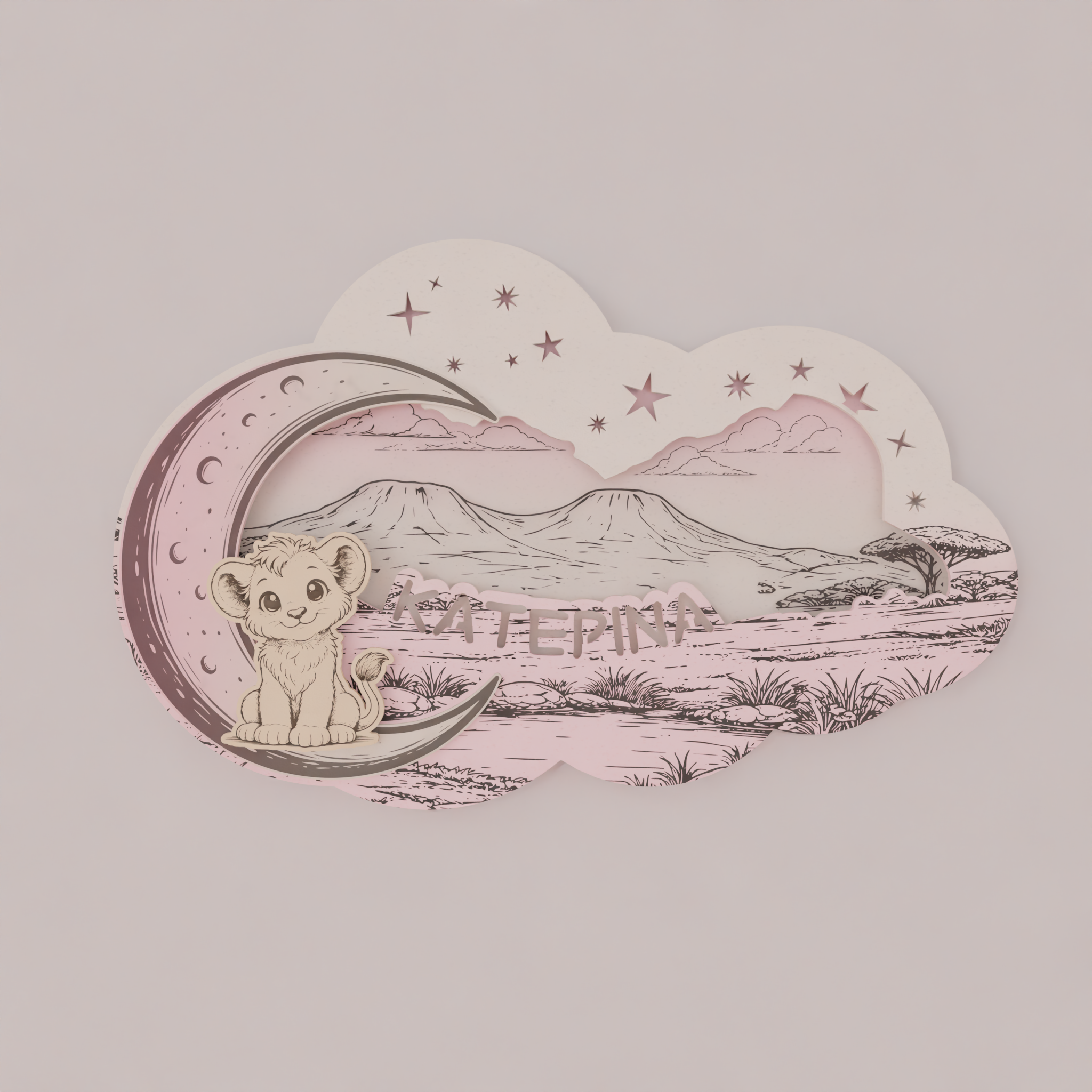 Το όνομα του παιδιού χαράσσεται στο σχέδιο, κάνοντας το φωτιστικό μοναδικό και απόλυτα προσωπικό. Ο απαλός φωτισμός LED 7 χρωμάτων λειτουργεί ιδανικά ως νυχτερινό φως, χωρίς να κουράζει τα μάτια, προσφέροντας ζεστή ατμόσφαιρα στο χώρο.