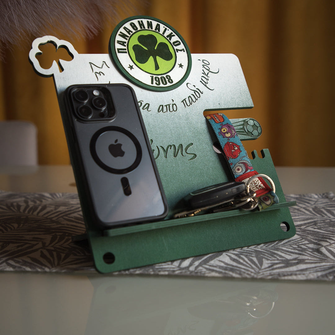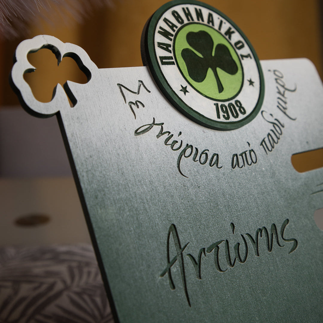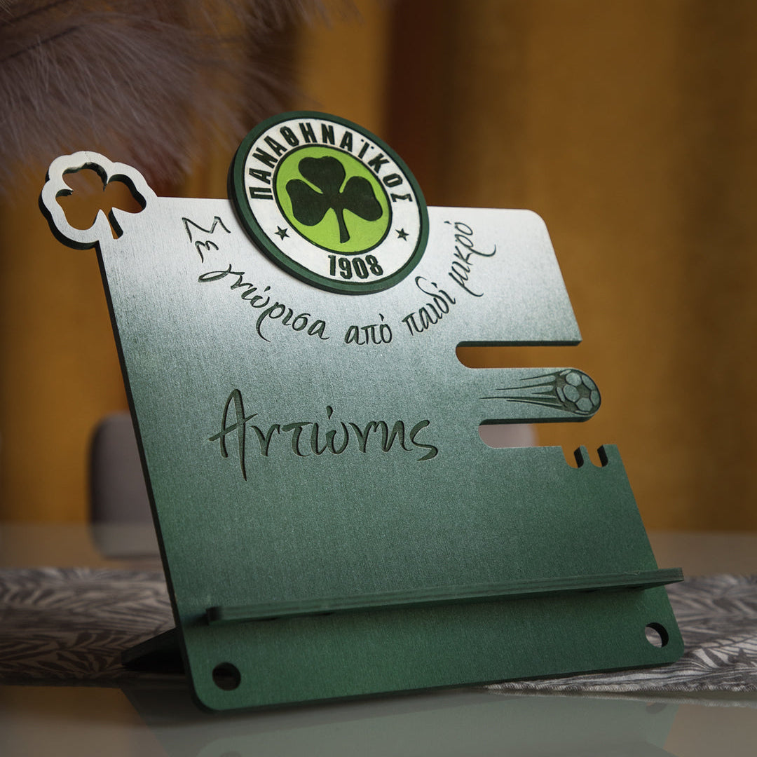 διαίτερη βάση με σχέδιο της αγαπημένης του ομάδας για το τάμπλετ, το βιβλίο ή το κινητό από ξύλο σημύδας 6mm, με ανθεκτικό σχεδιασμό. Περιλαμβάνει ειδική εσοχή για το φορτιστή και το καλώδιο ώστε να χρησιμοποιείται εύκολα ακόμη και κατά τη φόρτιση.