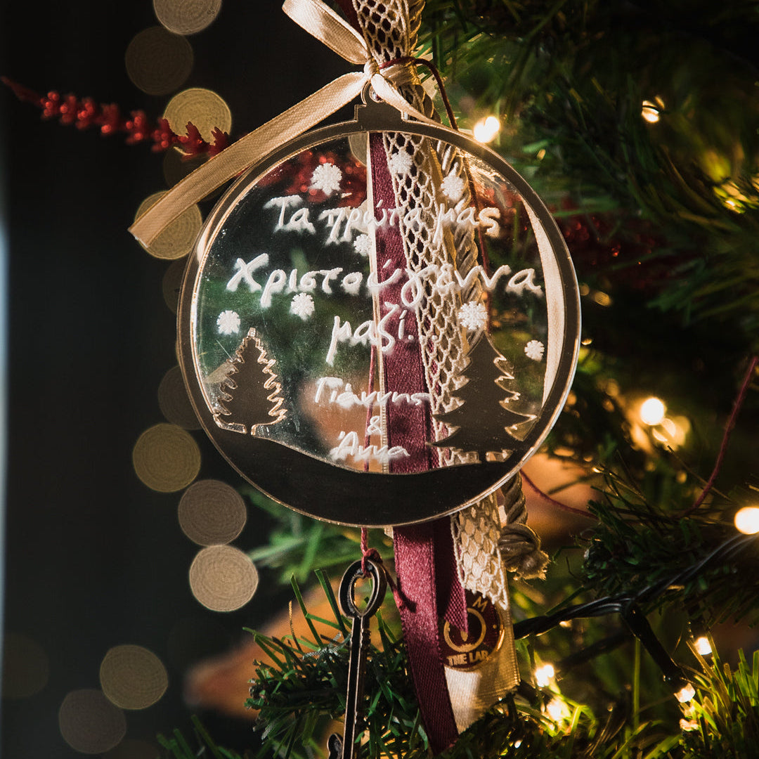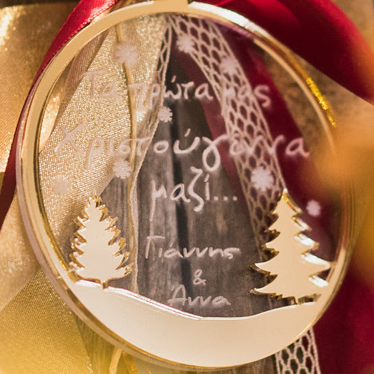 Ένα χρυσό στολίδι που κρατά μέσα του την πρώτη σας κοινή γιορτή. Το plexiglass αφήνει το φως να απλωθεί καθαρό, ενώ τα ονόματά σας χαράζονται επάνω του σαν μικρή αφήγηση που μόλις ξεκινά. Ένα σημάδι αυτής της πρώτης χρονιάς μαζί, απλό και ζεστό, που θα επιστρέφει κάθε Δεκέμβρη για να θυμίζει από πού άρχισε η ιστορία σας.