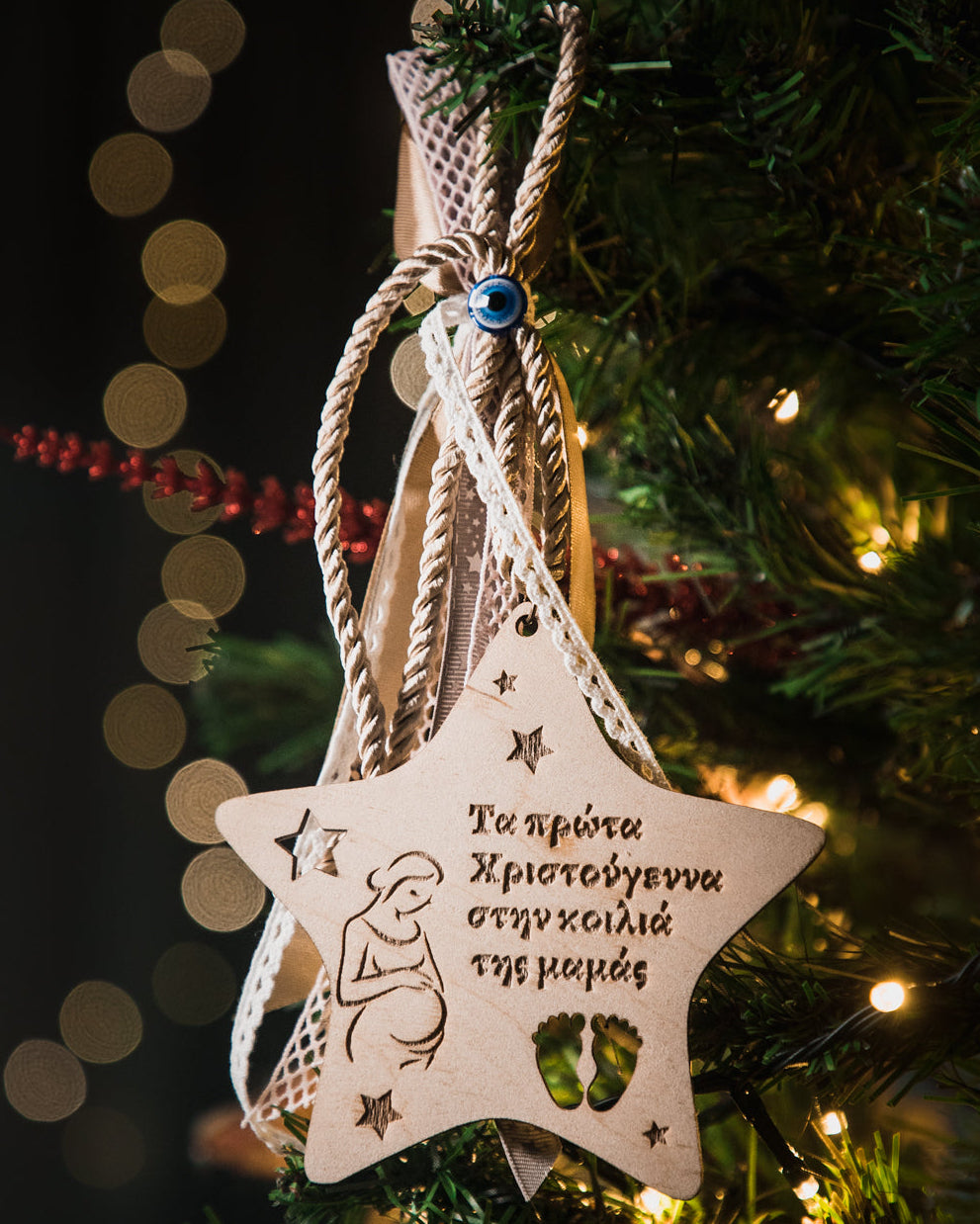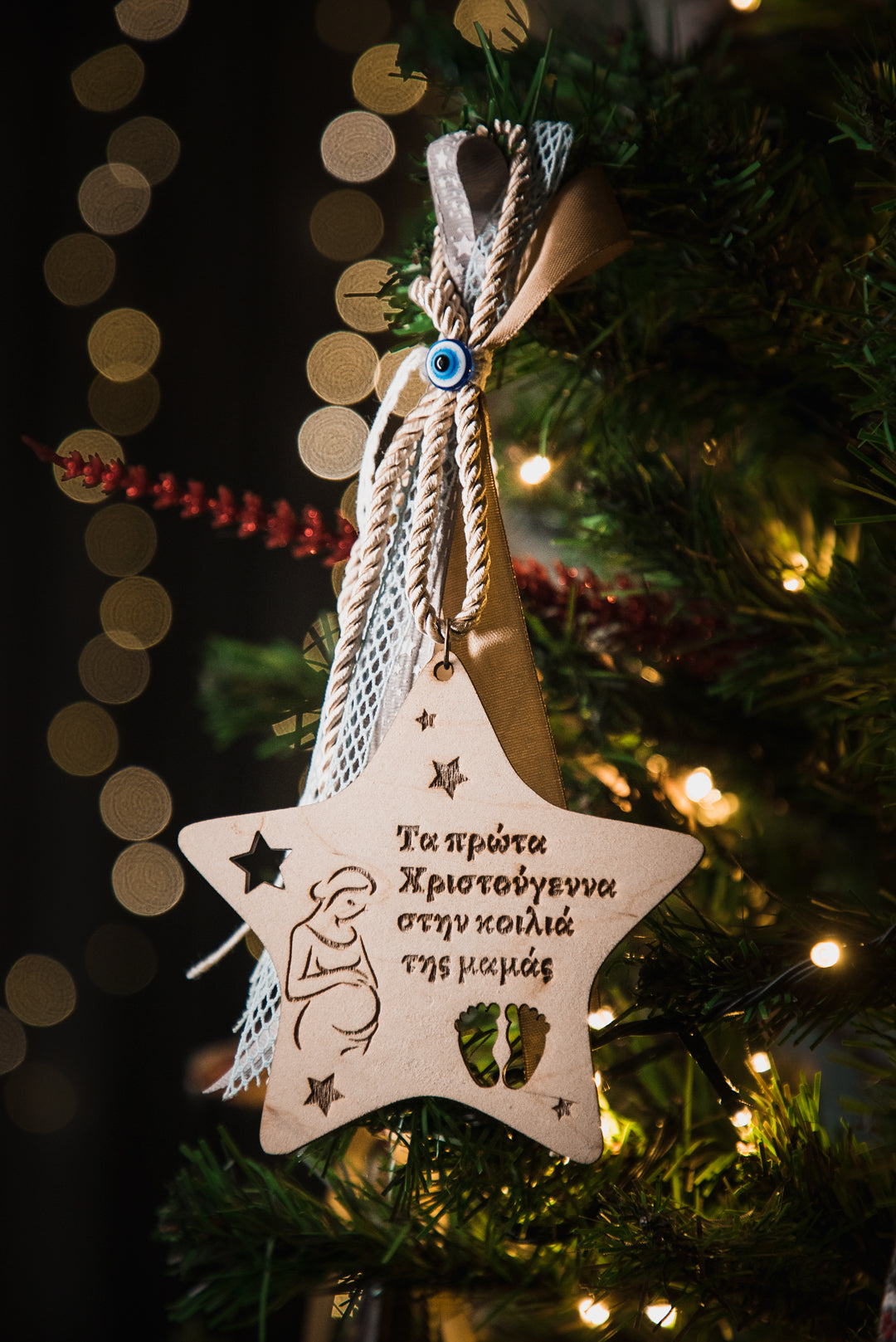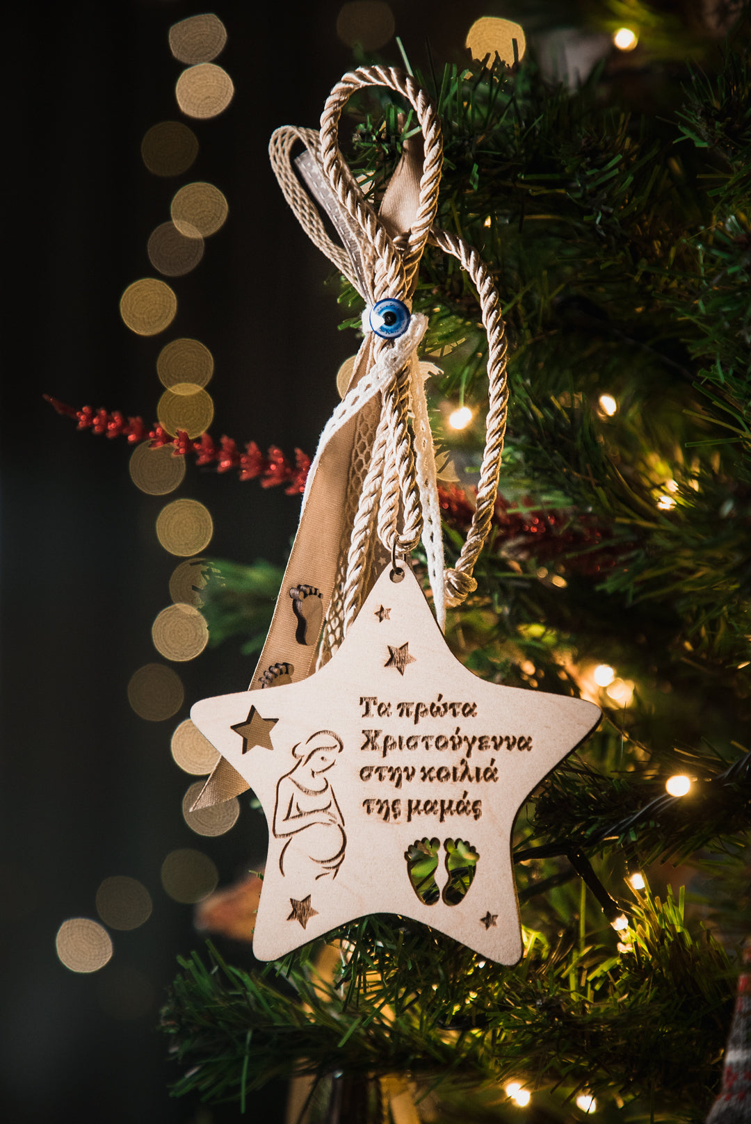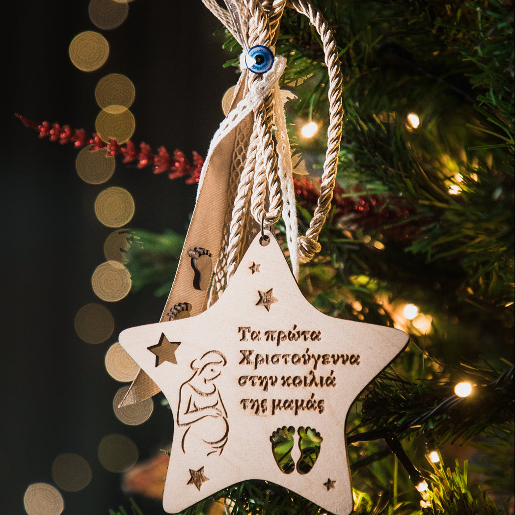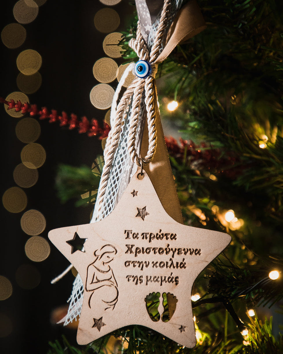 Μοναδικό αναμνηστικό γιορτινό στολίδι αστέρι για "Τα πρώτα Χριστούγεννα στην κοιλιά της μαμάς". Η μοναδική εμπειρία της κύησης και της αναμονής του παιδιού σας κάνει τα φετινά Χριστούγεννα ξεχωριστά. Γι' αυτό φροντίσαμε με αυτό το στολίδι να σας συντροφεύει αυτή η ανάμνηση στο χρόνο.