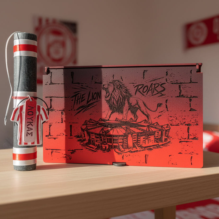 Ξύλινη κασετίνα-κουτί 15,5 × 28 εκατοστών, ύψος 6 εκατοστών, με το σχέδιο “Thrilos Lion Roars” εξωτερικά και εσωτερική χάραξη του γηπέδου Καραϊσκάκη, προσωποποιημένη με όνομα
