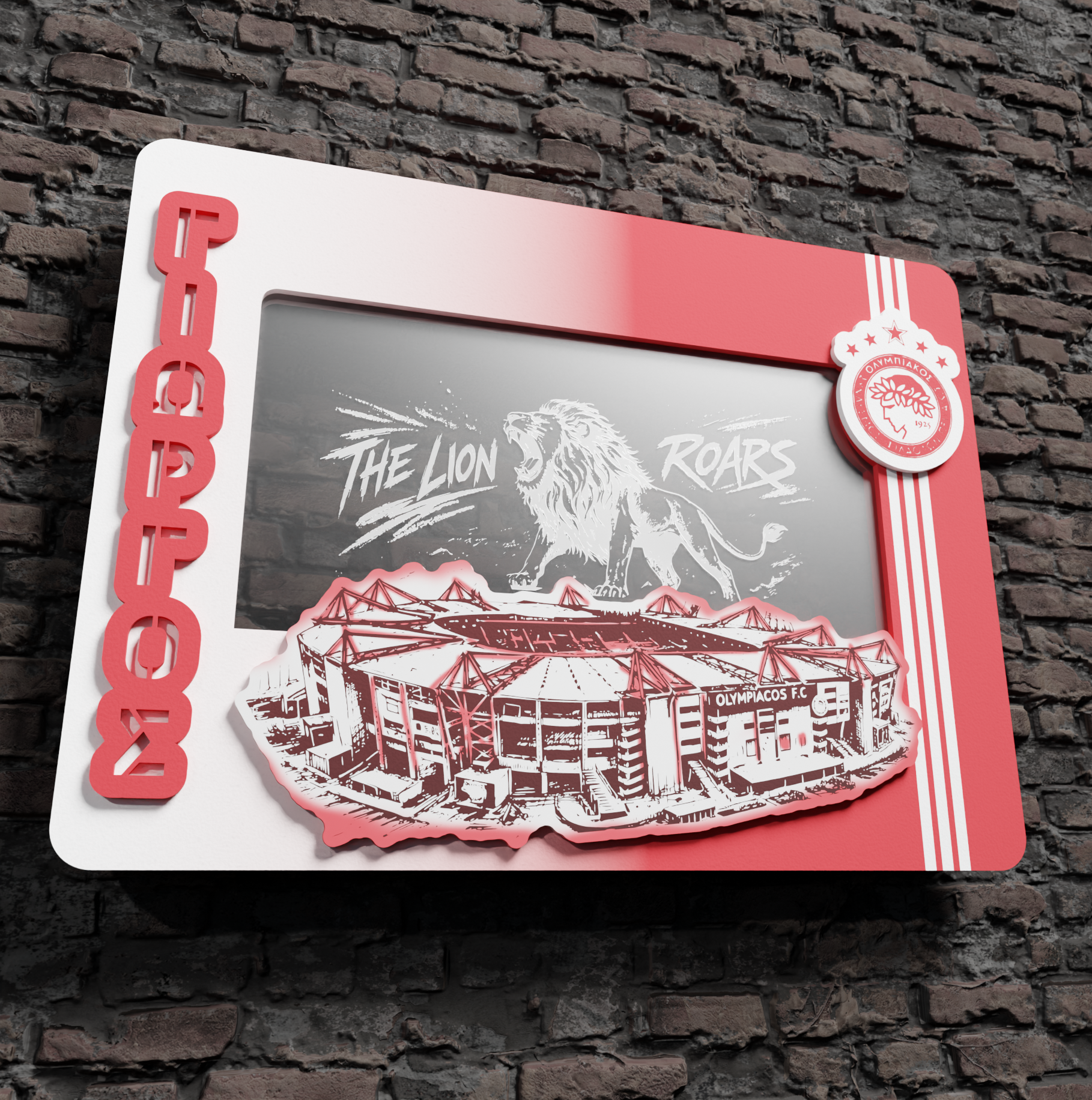 Το κάδρο είναι κατασκευασμένο από ξύλο και plexiglass, με ιδιαίτερη χάραξη του Lion Roars, ενώ στο κεντρικό μέρος δεσπόζει η 3D αισθητική πρόσοψη του γηπέδου Καραϊσκάκη, προσφέροντας βάθος, δυναμισμό και μοναδική οπτική ένταση.