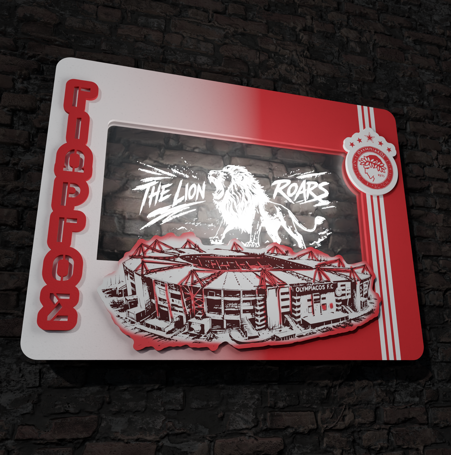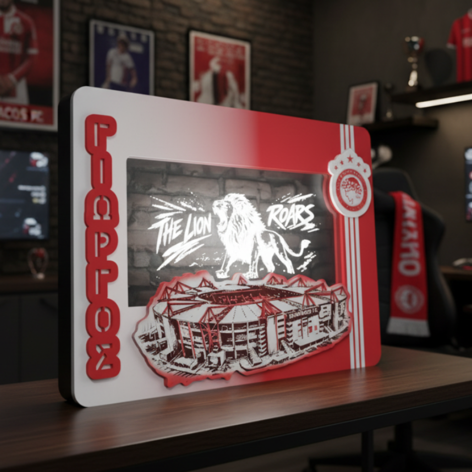 Ένα ξεχωριστό φωτιζόμενο κάδρο που ενώνει το λιοντάρι του Θρύλου με το σπίτι του, το Καραϊσκάκη, και φέρνει την ατμόσφαιρα της εξέδρας στον χώρο σου! 🔴⚪🦁