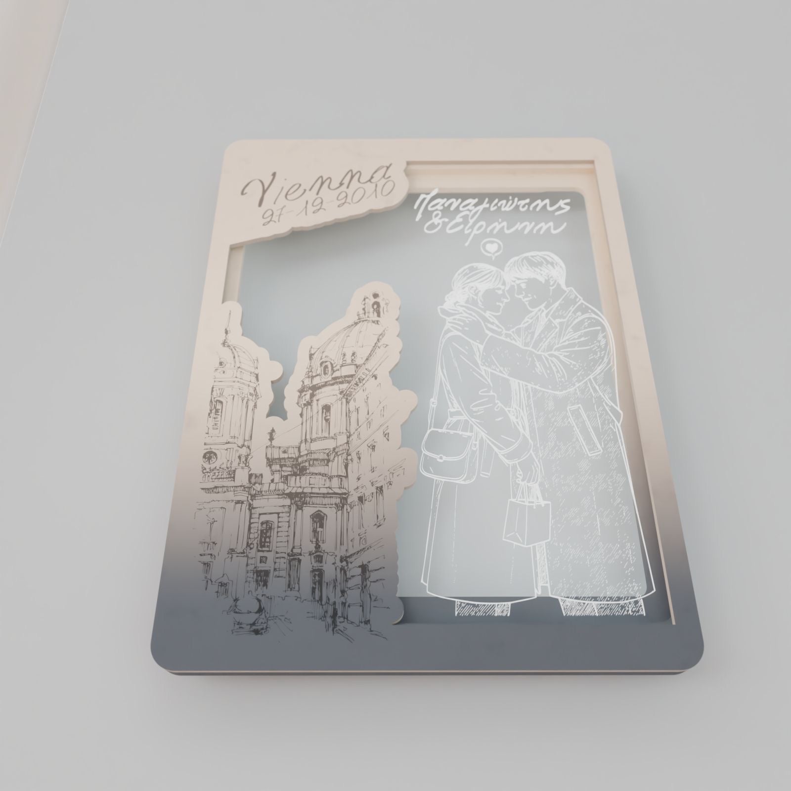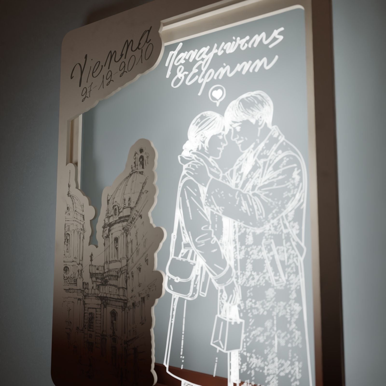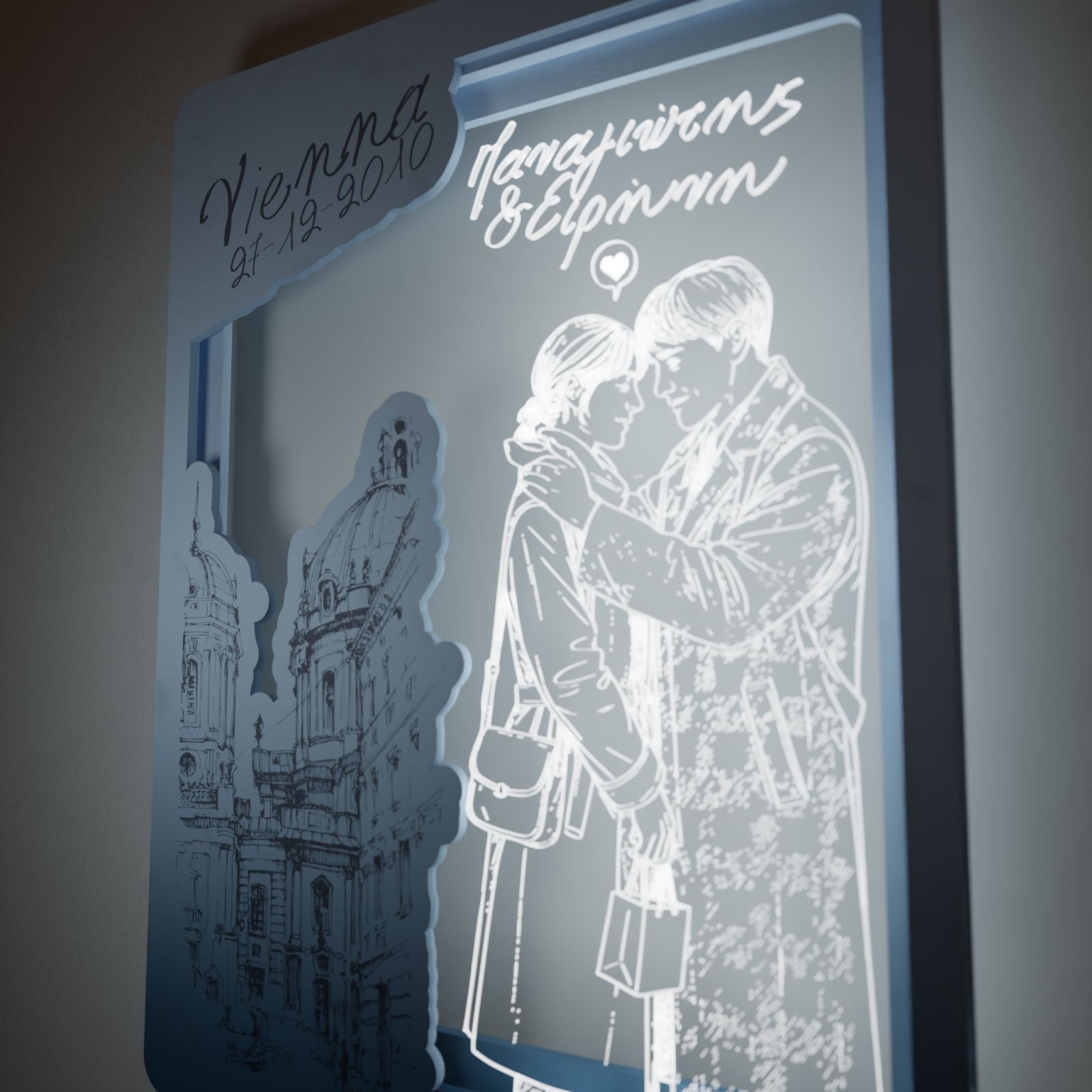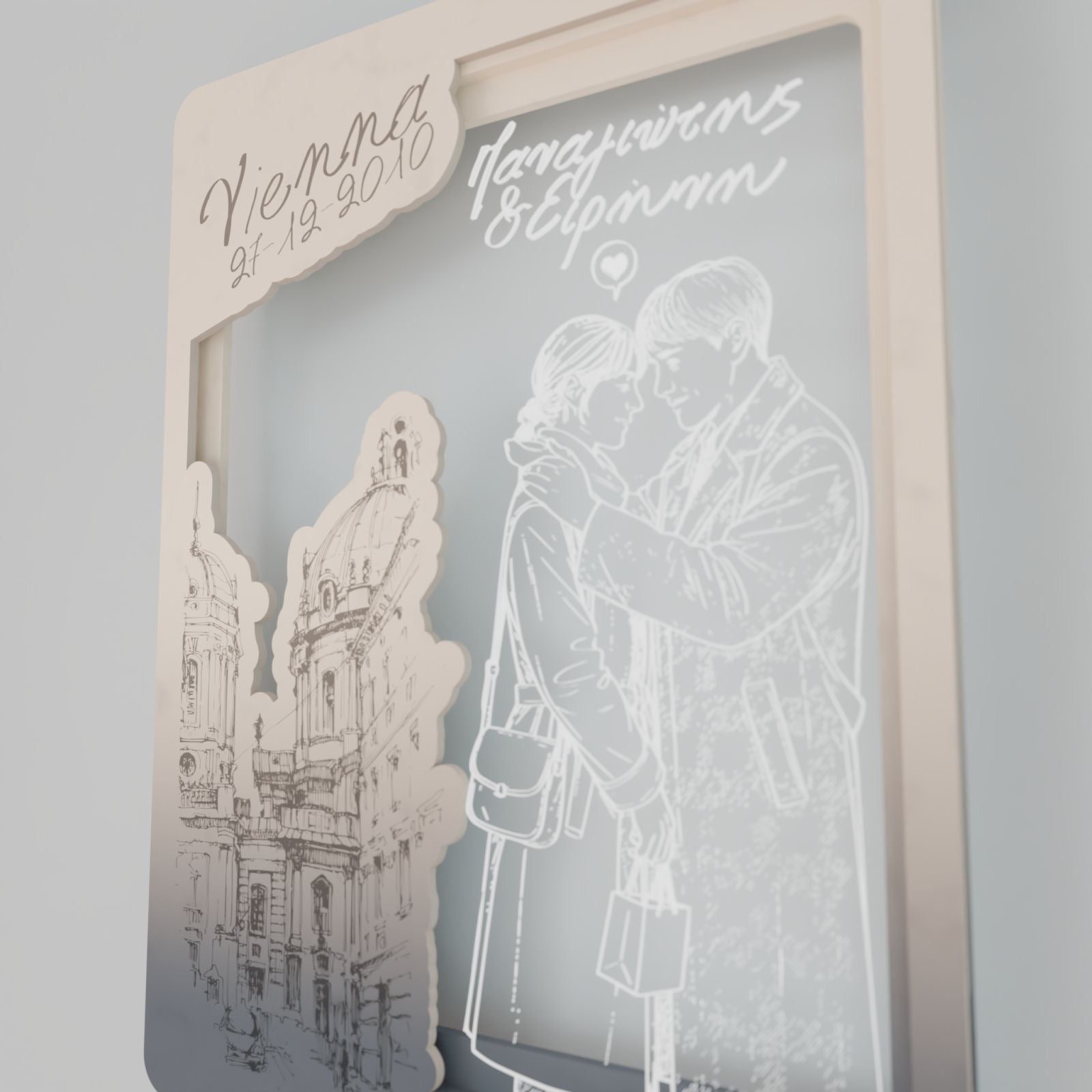 Στο κέντρο του κάδρου, το διάφανο plexiglass φιλοξενεί το νεαρό ζευγάρι, χαραγμένο με λεπτές γραμμές σαν να αιωρείται μέσα στο φως. Εκεί μπορείς να χαράξεις τα ονόματά σας, διακριτικά αλλά για πάντα, ώστε το έργο να μιλά αποκλειστικά για εσάς.