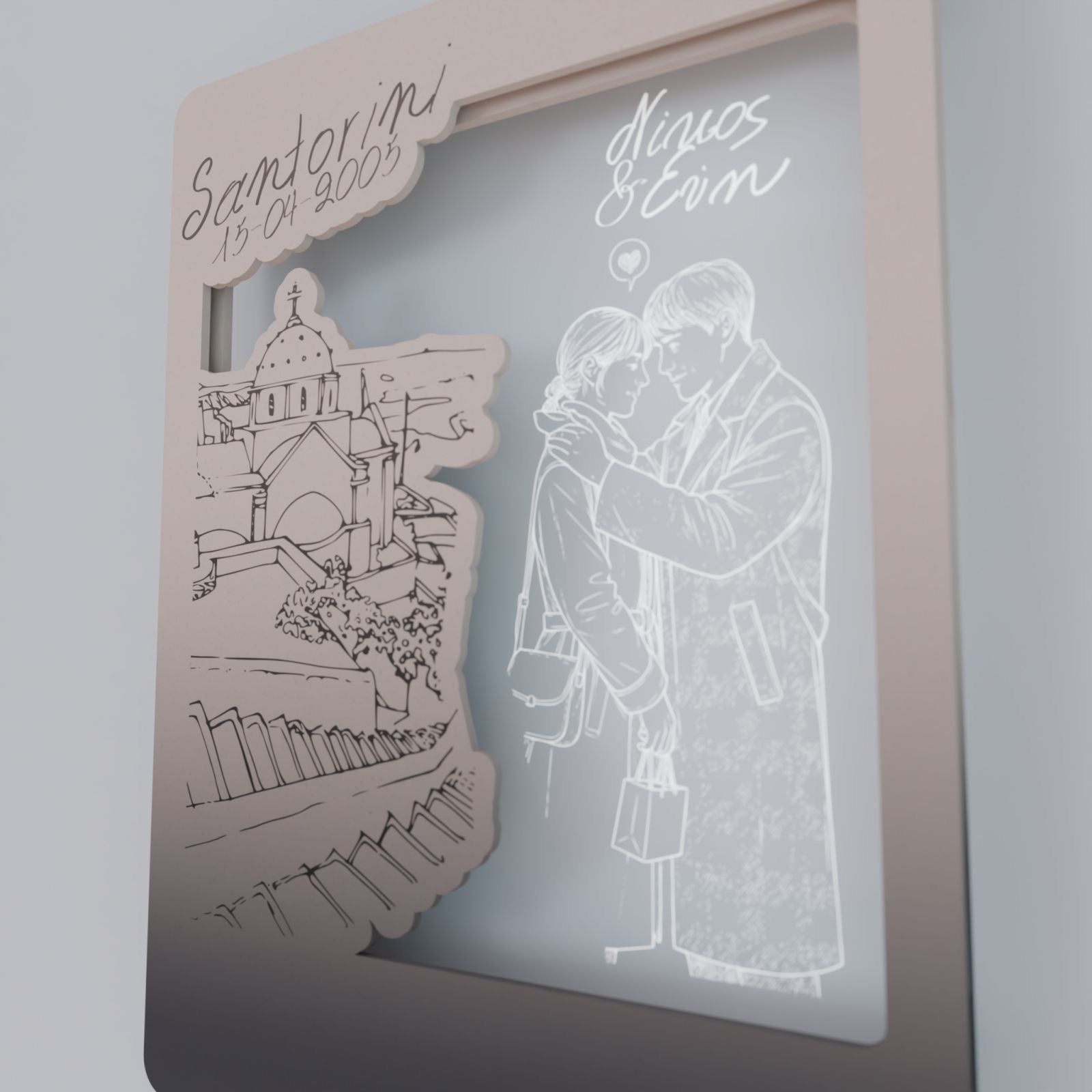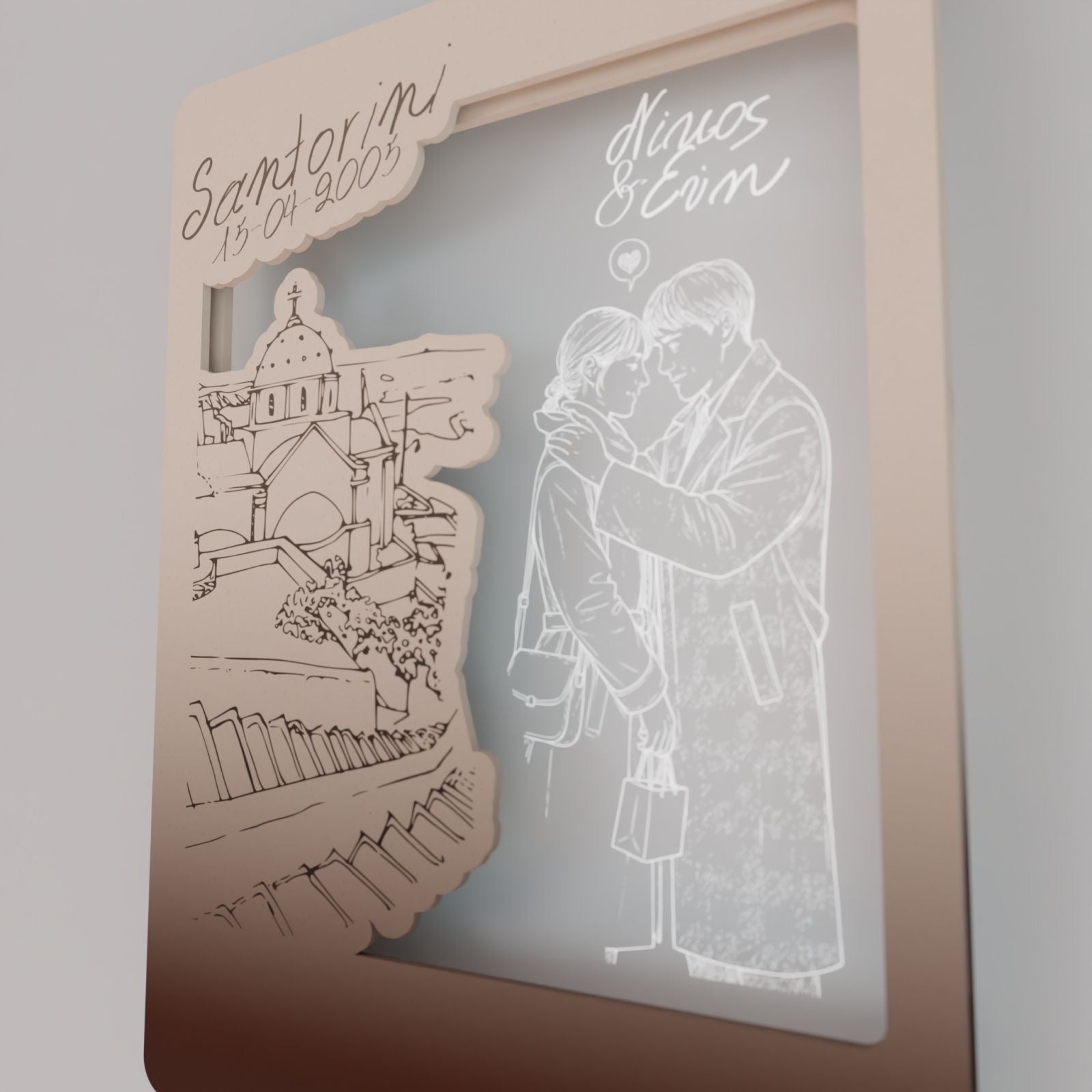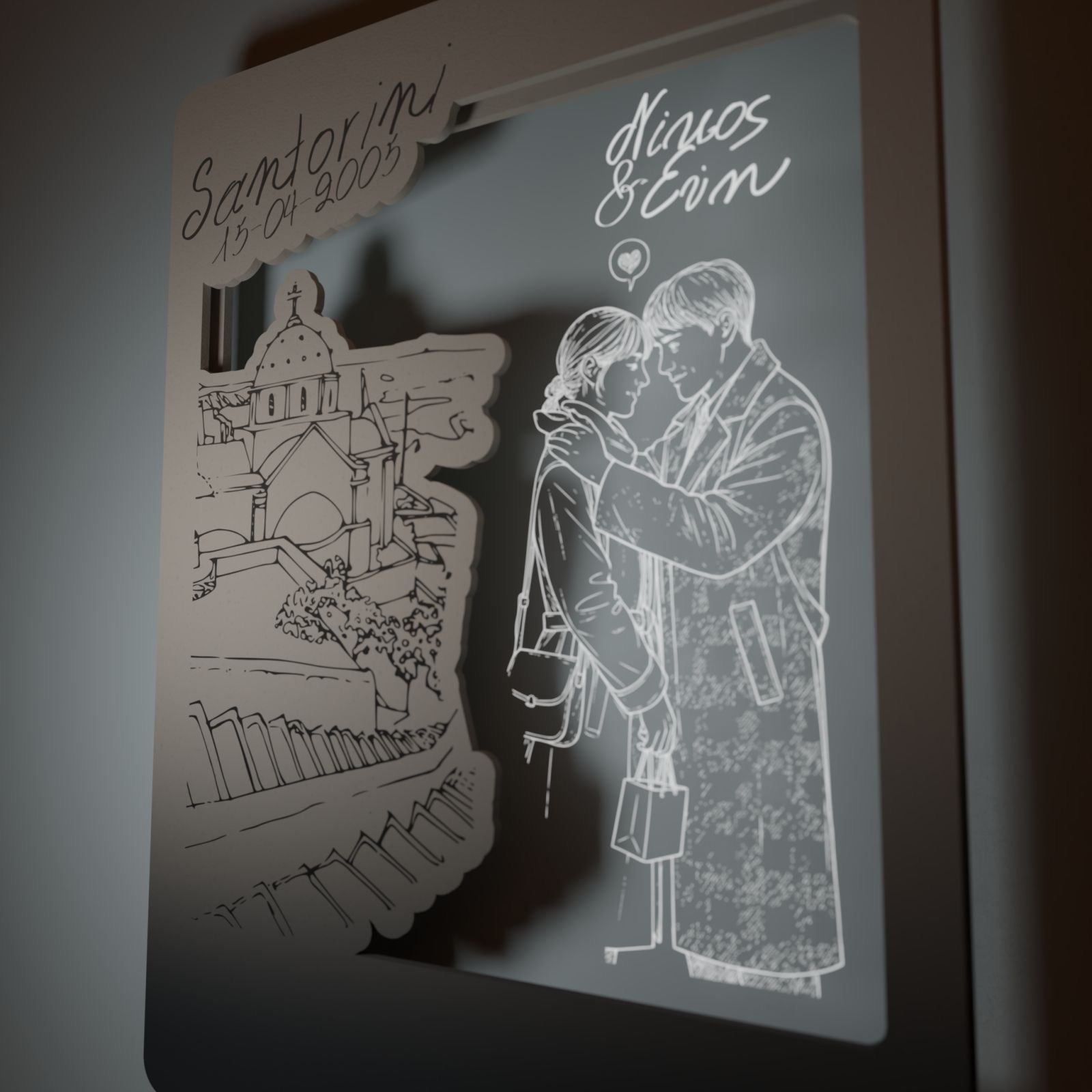 Στο κέντρο του κάδρου, το διάφανο plexiglass αγκαλιάζει το νεαρό ζευγάρι, χαραγμένο με λεπτότητα και συναίσθημα. Οι μορφές μοιάζουν να ενώνονται μέσα στο φως, ενώ τα ονόματά σας μπορούν να χαραχτούν, μετατρέποντας το έργο σε μια προσωπική εξομολόγηση αγάπης.