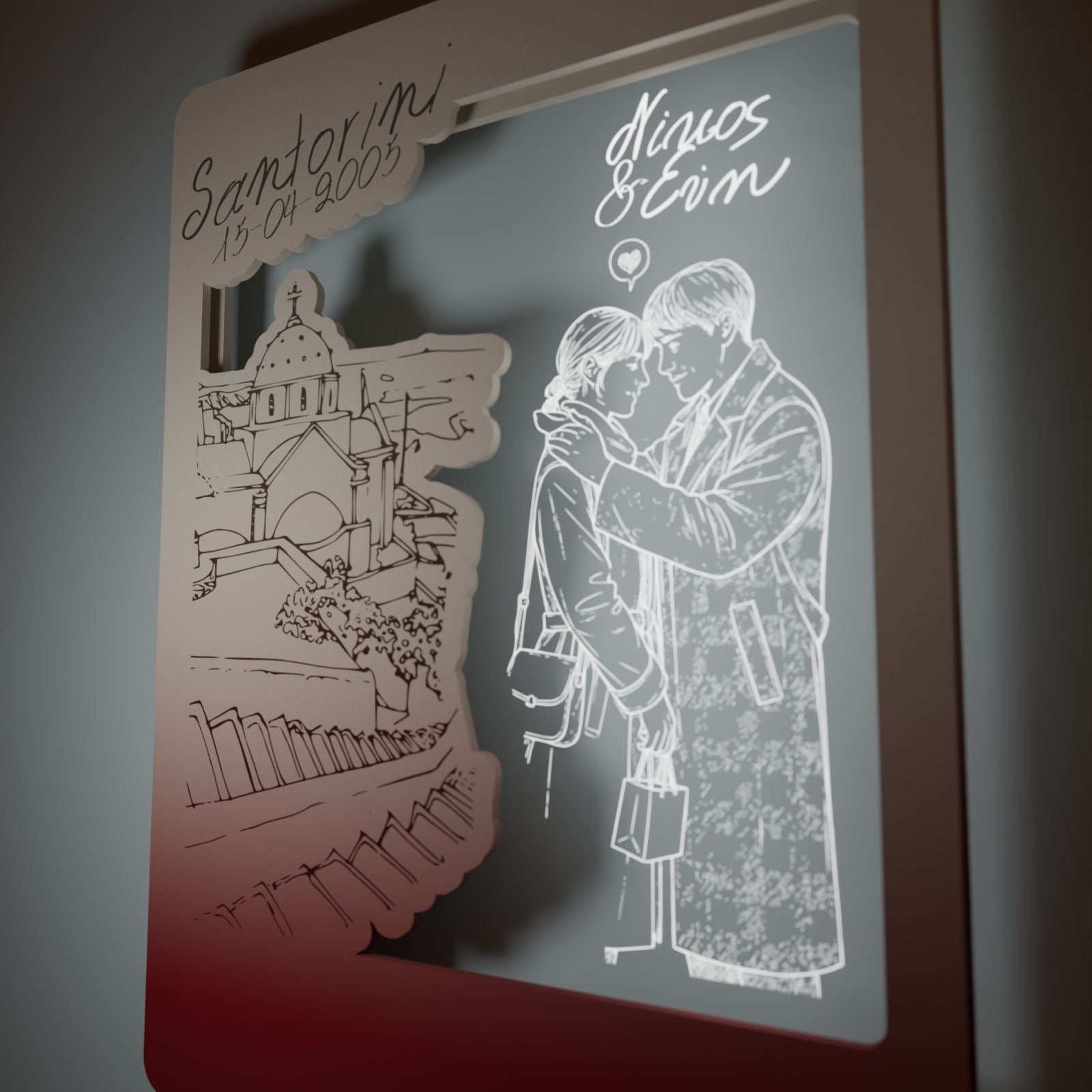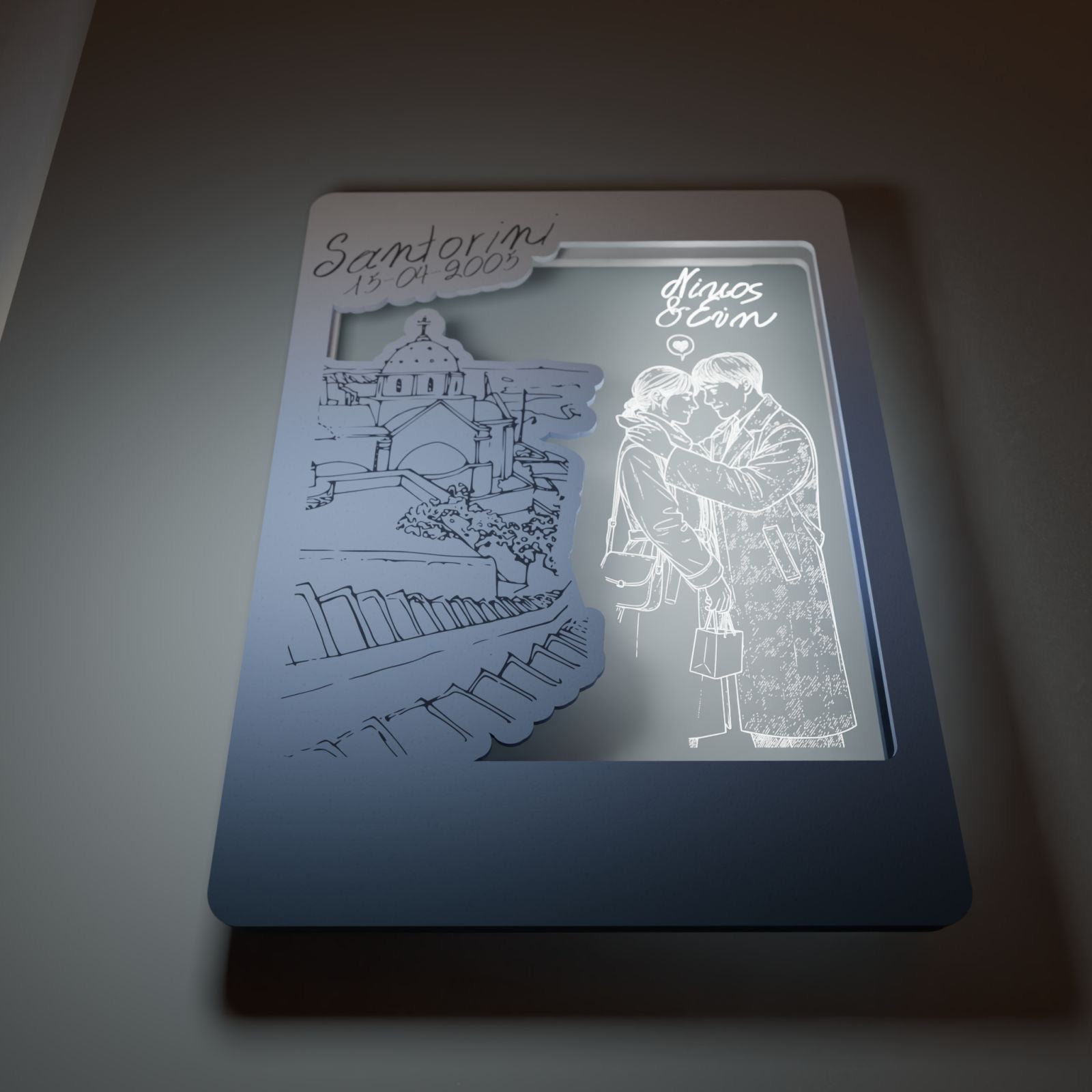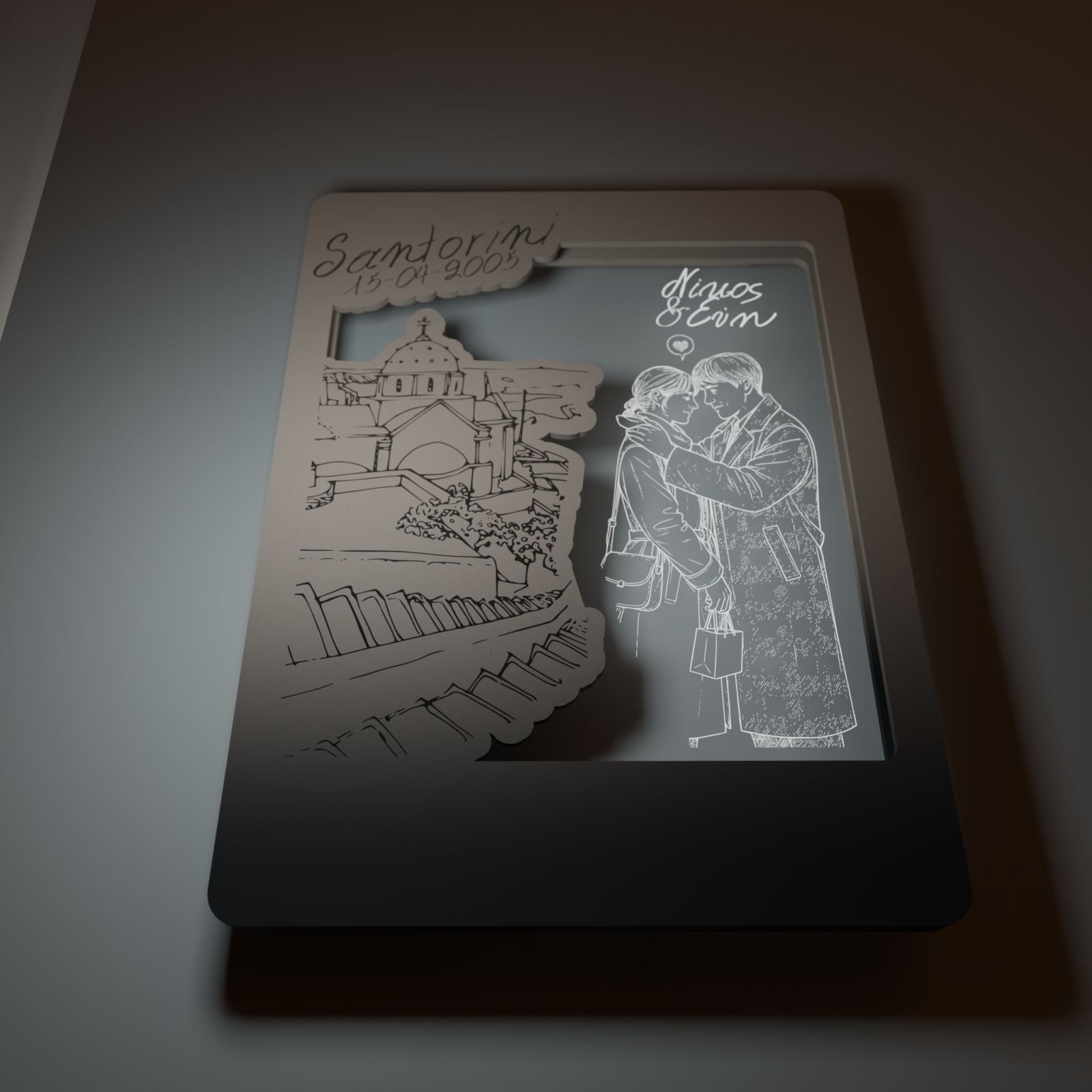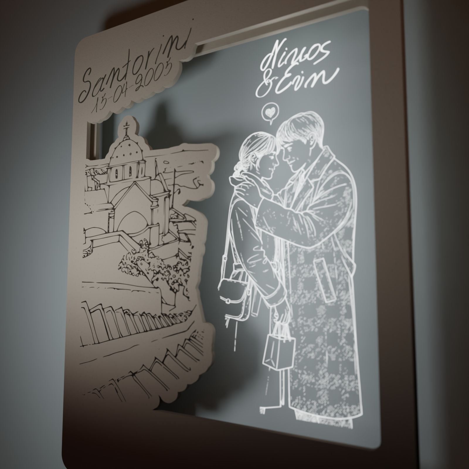 Στο κέντρο του κάδρου, το διάφανο plexiglass αγκαλιάζει το νεαρό ζευγάρι, χαραγμένο με λεπτότητα και συναίσθημα. Οι μορφές μοιάζουν να ενώνονται μέσα στο φως, ενώ τα ονόματά σας μπορούν να χαραχτούν, μετατρέποντας το έργο σε μια προσωπική εξομολόγηση αγάπης.