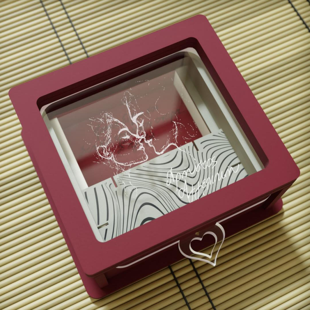 Δημιουργήσαμε ένα ξεχωριστό κουτί από ξύλο και plexiglass με δυνατότητα χάραξης των ονομάτων που επιθυμείτε στο plexiglass και κρυφό μήνυμα στο εσωτερικό του κουτιού.